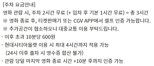 당일 영화 관람 시 주차 혜택 및 주차요금, 기타 주의사항을 확인하시기 바랍니다.