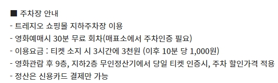 당일 영화 관람 시 주차 혜택 및 주차요금, 기타 주의사항을 확인하시기 바랍니다.