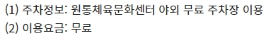 • 원통체육문화센터 야외 무료주차장을 이용하시면 됩니다.