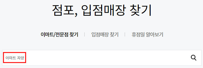 점포찾기에서 방문할 이마트 자양점을 입력 후 돋보기 버튼을 클릭하시면 됩니다.