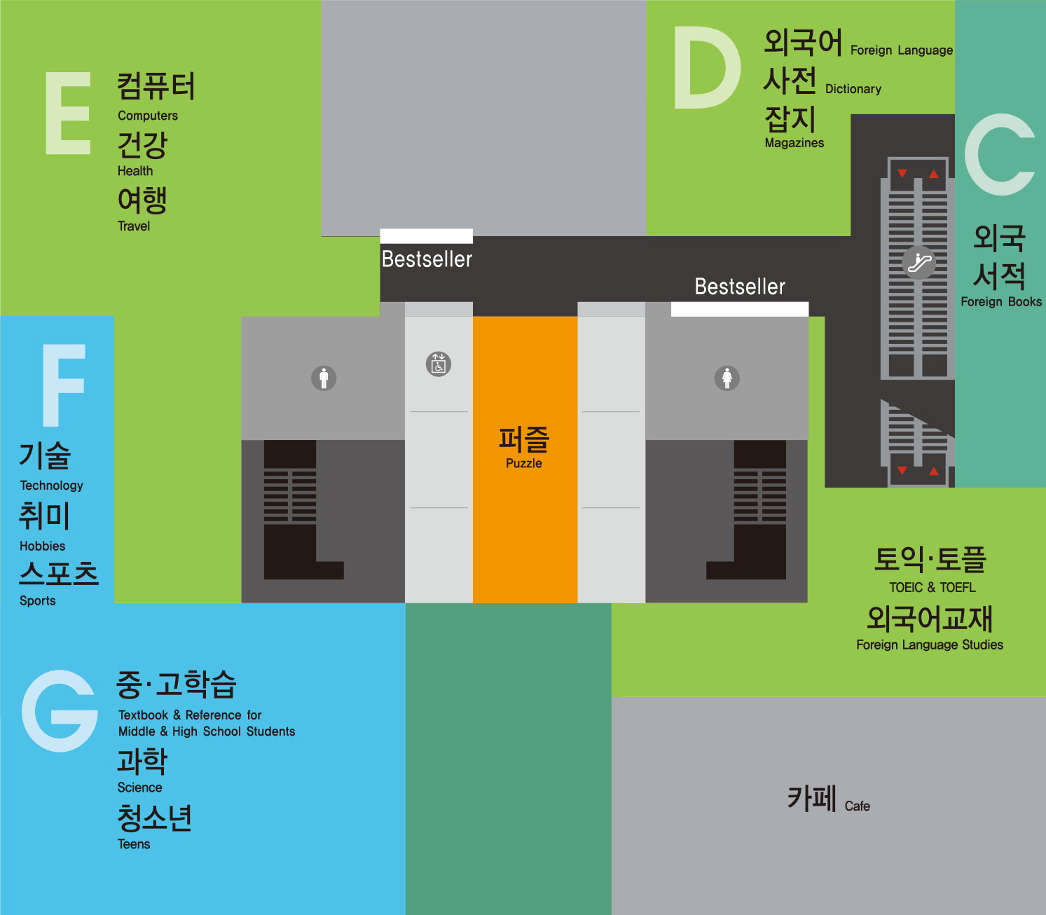 | 서가 E | 컴퓨터, 여행, 건강 |