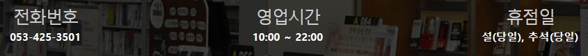 교보문고 대구점 영업시간 : 10:00 ~ 22:00 (총 12시간 영업)