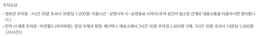 메가박스 분당 무료시간 초과 시, 주차 요금 : 초과 30분당 1,000원 주차요금 부과(제휴 주차장은 초과 10분당 1,00원 주차요금 부과)