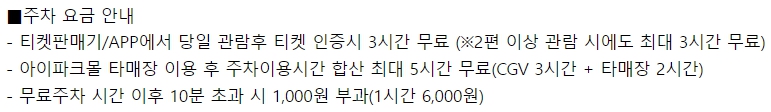 • 씨네드쉐프 용산아이파크몰 CGV 주차요금 : 무료주차시간 3시간 초과 10분당 1,000원 추가 주차요금이 발생합니다.
